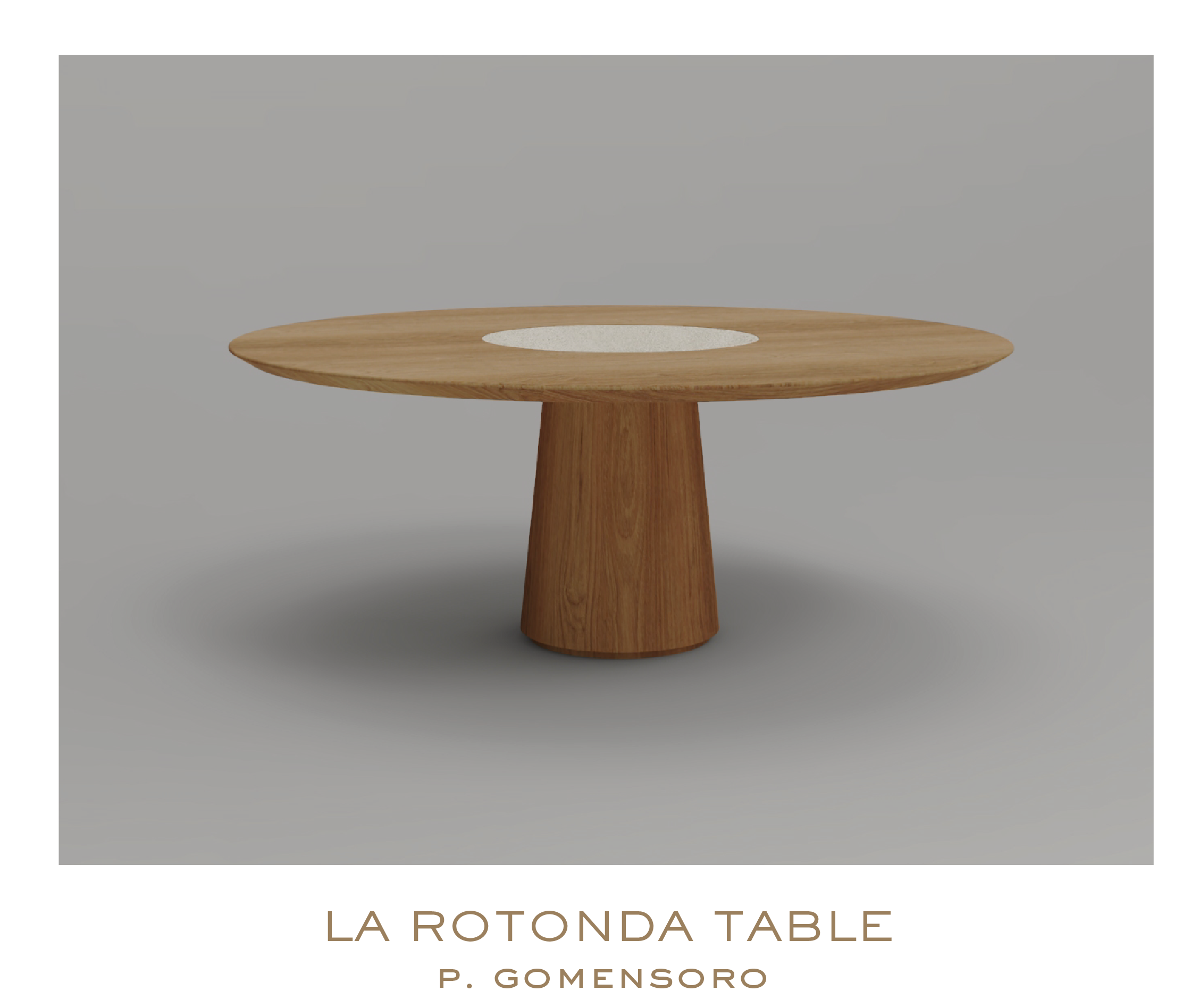 LA ROTONDA TABLE Materiality: Natural wood & a “Lazy Susan” in natural stone. Dimensions: Ø 180 x 75 cm Digital image designed by Pilar Gomensoro & Pampa Reynal.
