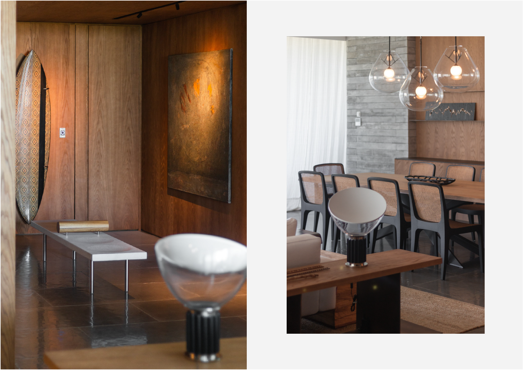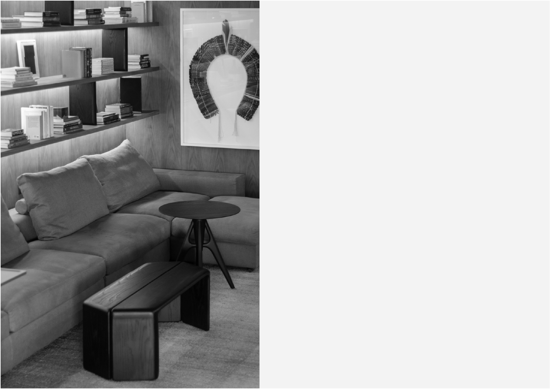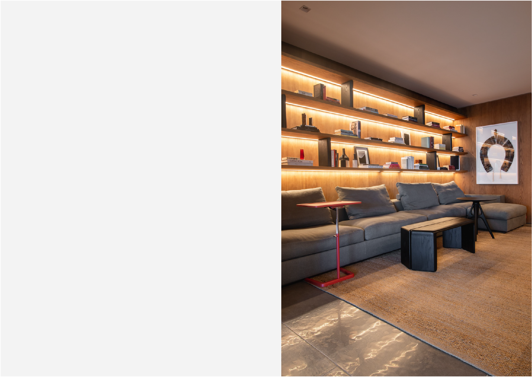 En el lounge area se colocó una pieza antique de diseño mid-century brasileño, la poltrona & otomana Alta de Oscar Niemeyer, generando un triángulo perfecto para escuchar el audio proveniente de los parlantes que aportan su personalidad al espacio. Se colocó una mesa de juego & trabajo diseñada por Jader Almeida, diseñador contemporáneo brasileño.