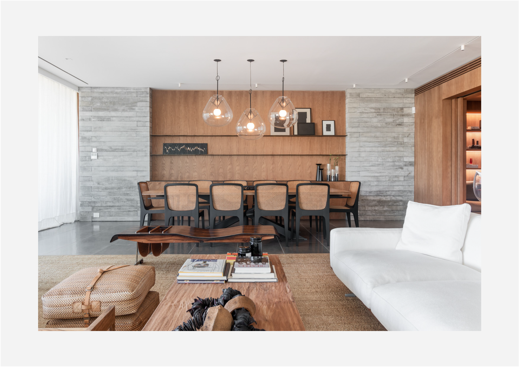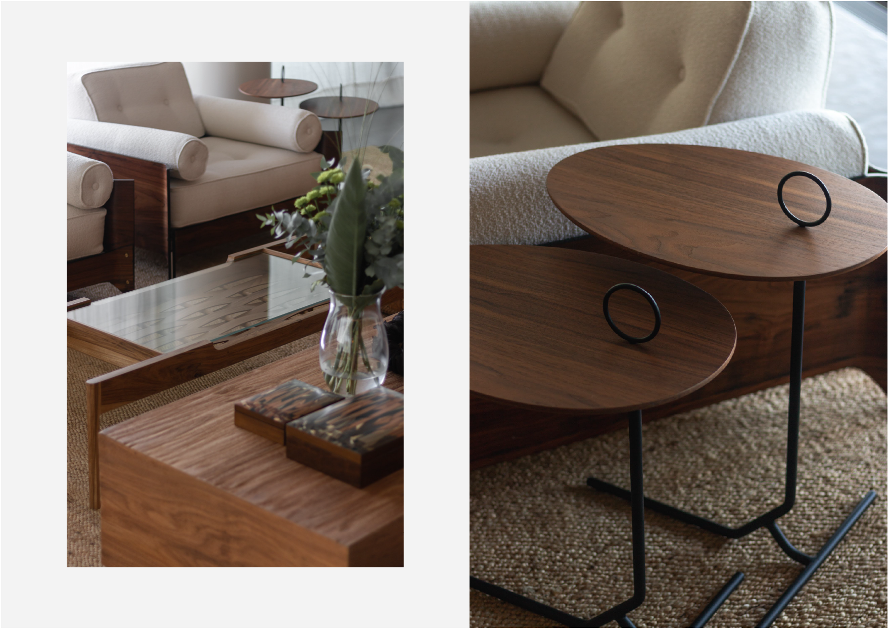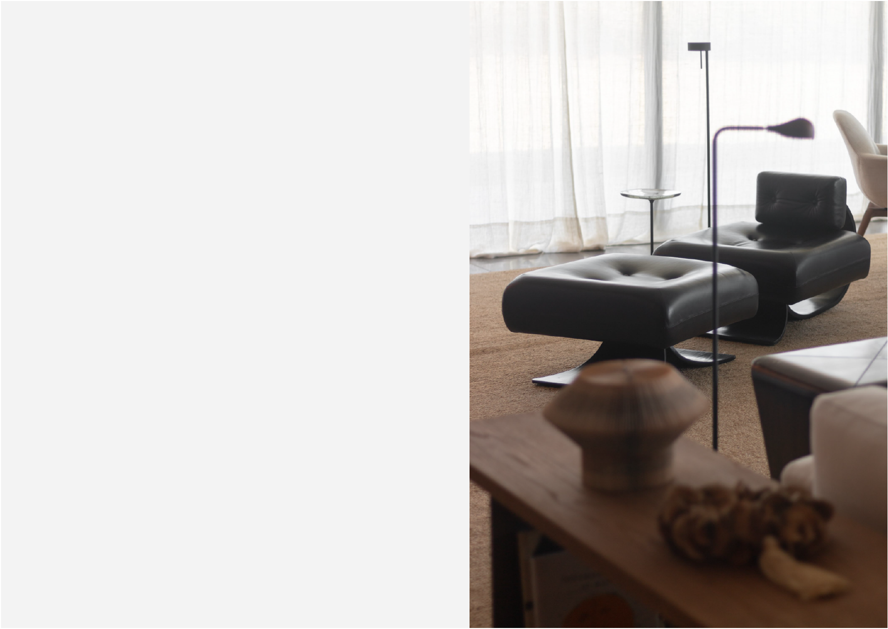 En el lounge area se colocó una pieza antique de diseño mid-century brasileño, la poltrona & otomana Alta de Oscar Niemeyer, generando un triángulo perfecto para escuchar el audio proveniente de los parlantes que aportan su personalidad al espacio. Se colocó una mesa de juego & trabajo diseñada por Jader Almeida, diseñador contemporáneo brasileño.