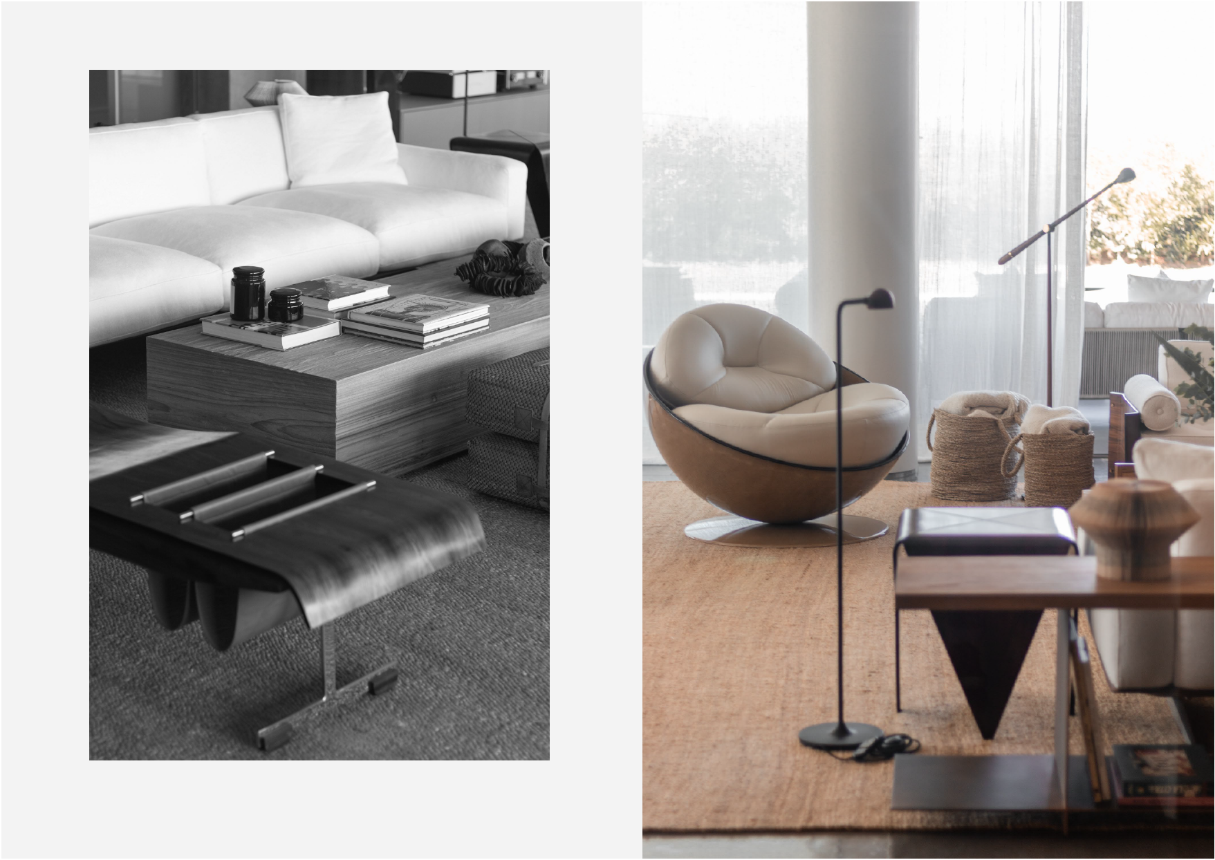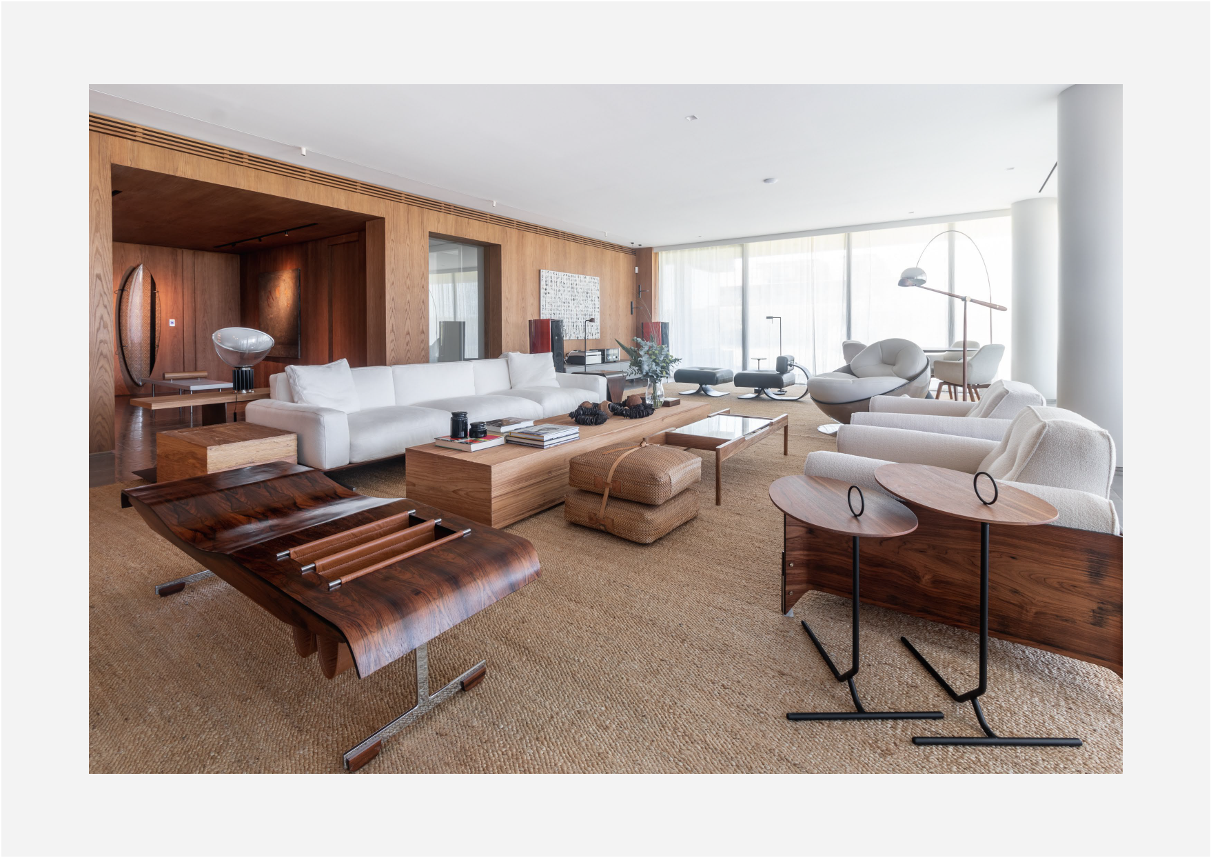 El área de living contiene el sofá Grandemare de Flexform, se decidió dejarlo limpio con pocos almohadones respetando su diseño liviano. Enfrentadas al sofá se colocaron dos poltronas más pesadas, las Brasilianas diseñadas por el diseñador brasileño de mid-century Jorge Zalszupin. Estás piezas provenientes de un anticuario en Brasil tienen la estructura compuesta por madera enchapada de jacarandá y se tapizaron en boucle off-white para darle un look lay-back. El ícono del living es la poltrona Esfera del diseñador brasileño Ricardo Fasanello, esta alude al space-age y genera un ambiente más lúdico y de ilusión.