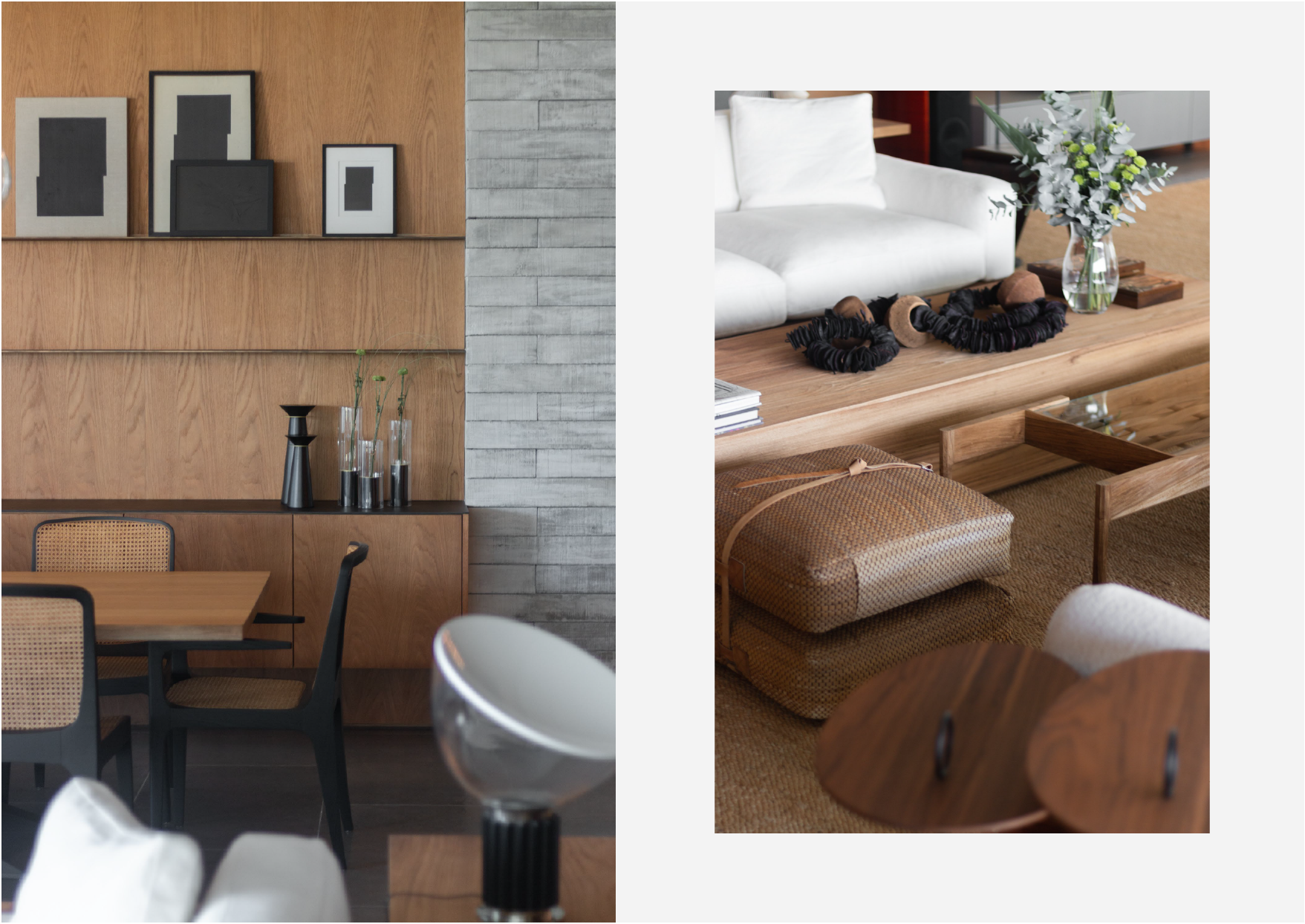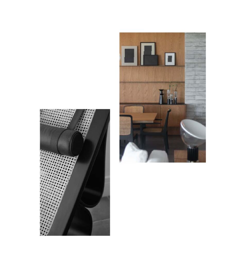 En el comedor se decidió generar un nicho conteniendo un aparador de guardado se lo remarcó generando un contraste con dos paredes laterales en cemento. La repetición de las sillas del comedor en esterilla francesa y madera ebonizada generan un statement y aportan fuerza al espacio.