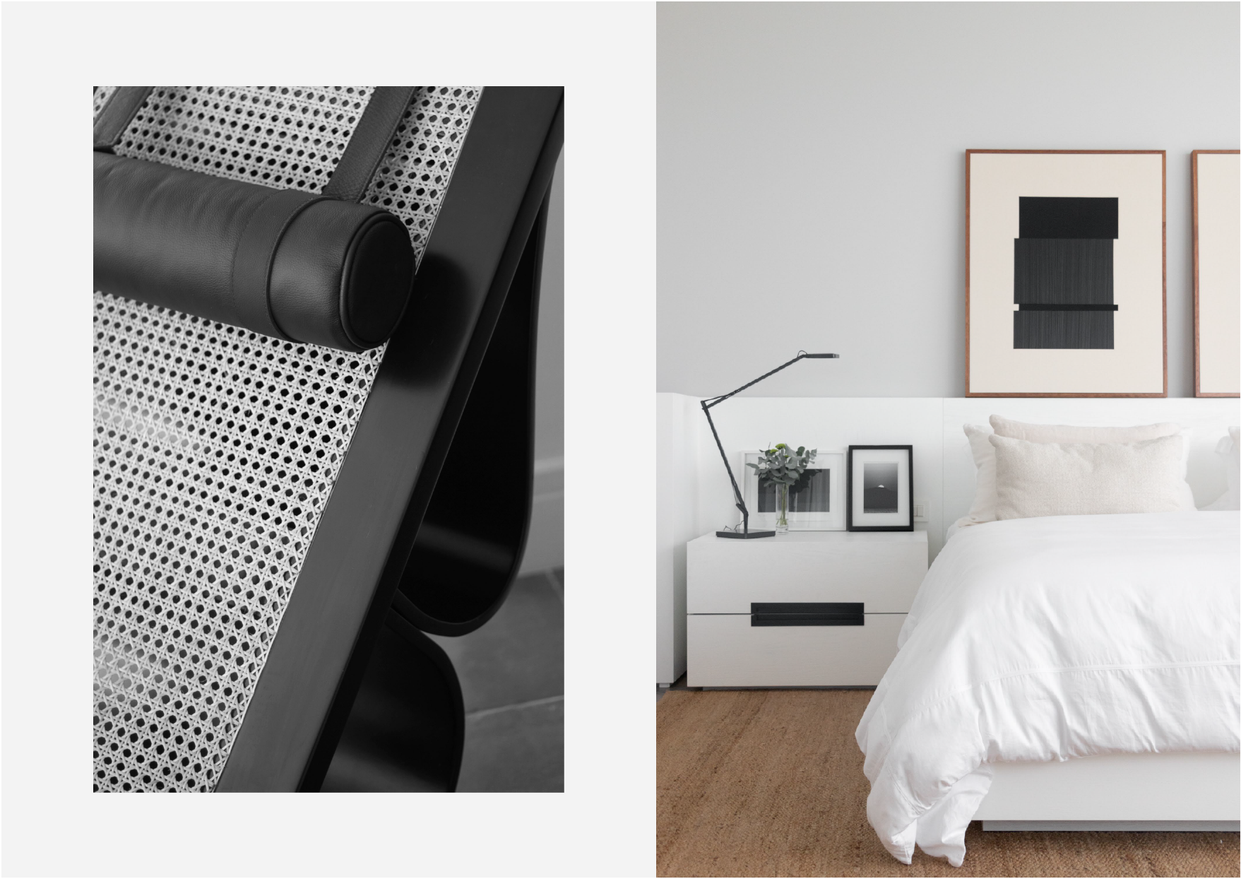 Para las suites se optó por un diseño súper clean, tonalidades blancas, distintas texturas de fibras naturales y obras de arte de artistas contemporáneos del Río de la Plata aportando identidad a cada espacio. En la suite principal se colocó una pieza de mid-century, la Rio chaise lounge de Oscar Niemeyer. Esta dota de sensualidad al espacio dialogando y generando tensión con las líneas rectas predominantes.