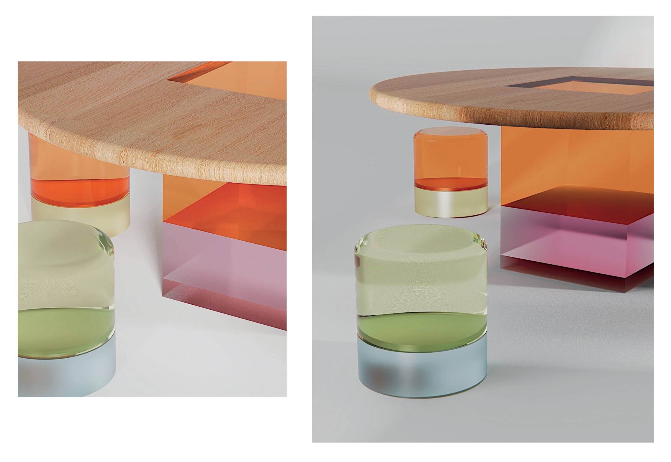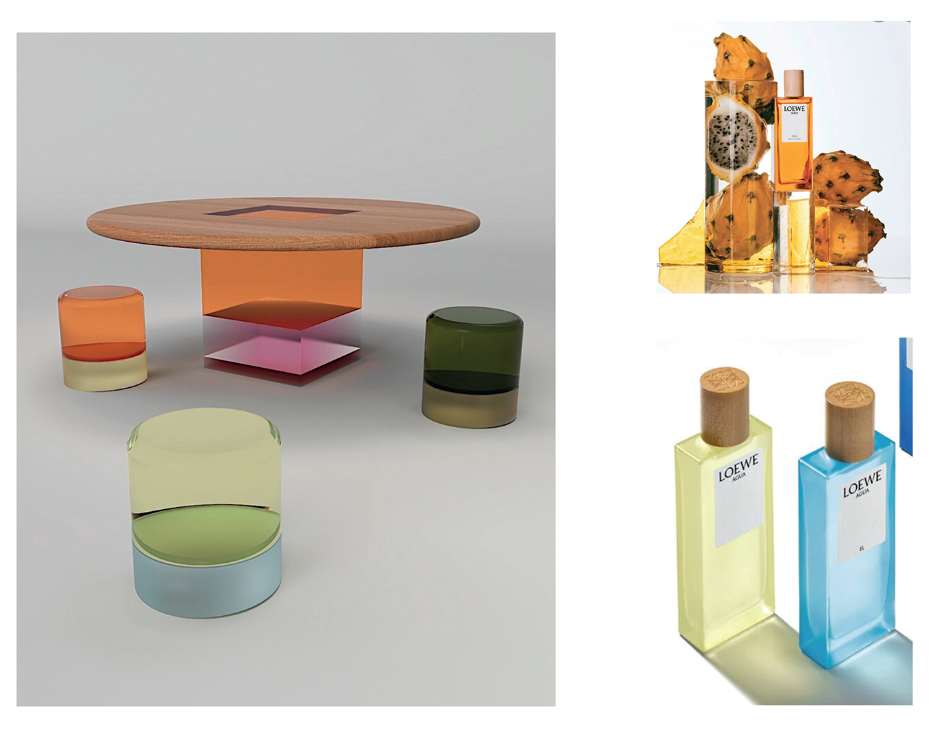 RAINBOW TABLE Inspired by the LOEWE botanical rainbow perfume collection. Materiality: Resine & natural wood. Digital image designed by Pilar Gomensoro & produced by Pampa Reynal.